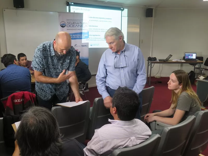 El citado análisis fue realizado por demás miembros de la Facultad de Ciencias de la Ingeniería UACh e investigadores del área ambiental y oceanográfica, quienes primeramente (etapa de diagnóstico y análisis) definieron un estado del arte de tecnologías y sistemas de cultivo vinculados con la acuicultura oceánica; analizaron en extenso la resolución 1821 y su marco normativo adicional o conexo (artefactos navales); y gestionaron una encuesta acerca de tecnologías para la acuicultura oceánica, dirigida a profesionales y directivos del rubro de la acuicultura, en Chile y en el extranjero, cuyos datos fueron presentados durante el taller/focus group.